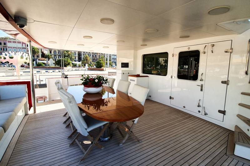 Akilis' exterior deck areas give a variety of options for relaxing and entertaining. The upper deck, which includes a flybridge and lounge area located forward of the wheelhouse, is all about relaxing in the sun. While the main aft deck area is the perfect al fresco dining location.