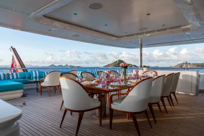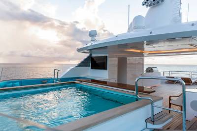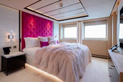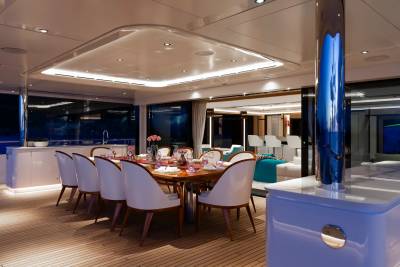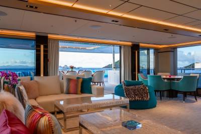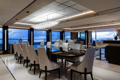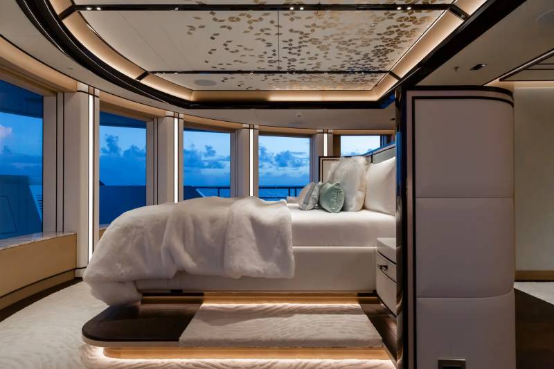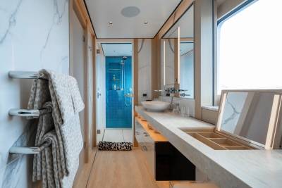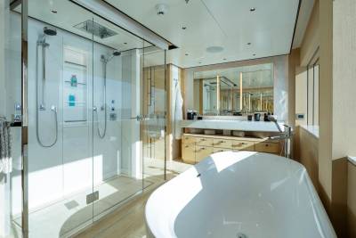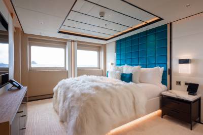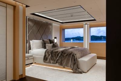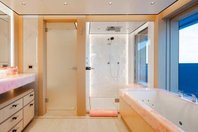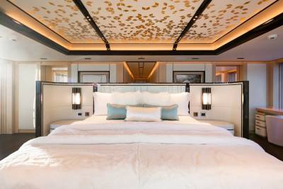 Experience unparalleled luxury in the owner’s suite aboard Asia, where expansive space and refined design combine. This exquisite retreat on the main deck boasts a private lounge, ensuite with a rainfall shower, and a freestanding bathtub. Positioned forward with panoramic vistas, the suite grants direct access to the private foredeck, featuring a jacuzzi and intimate dining and lounge areas. Complemented by a personal sky lounge with twin ensuites, an office, and dual outdoor decks, this sanctuary redefines bespoke comfort and exclusive living on the water.