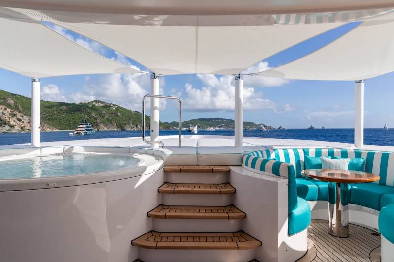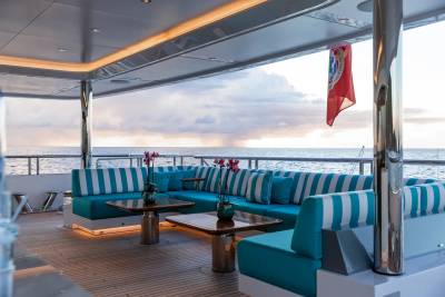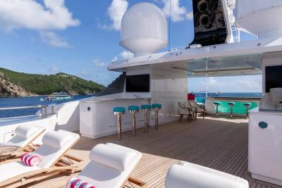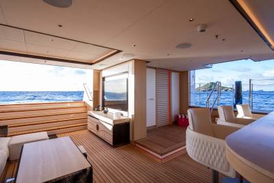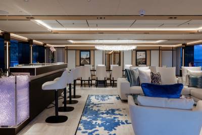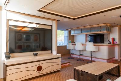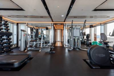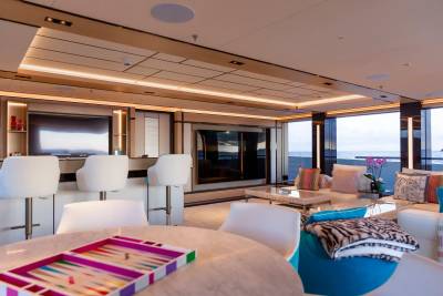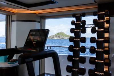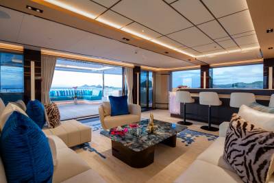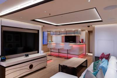 The bridge deck offers a sophisticated haven for social interaction, where an open-air lounge seamlessly merges with the sea, gently divided from the gym by sleek glass doors for uninterrupted flow. On the sun deck, guests are welcomed by expansive vistas and thoughtfully designed gathering spaces, including a chef’s grill station, a wet bar, and a Jacuzzi. Delivering the perfect ambiance for both lively celebrations and tranquil moments beneath the open sky.