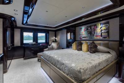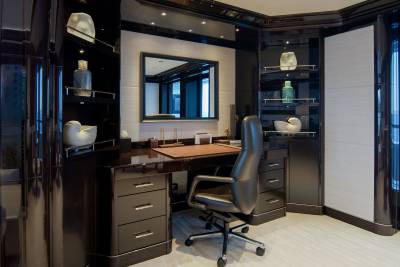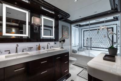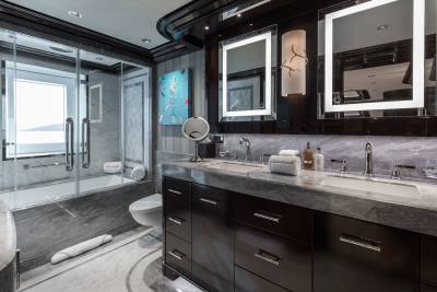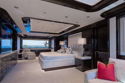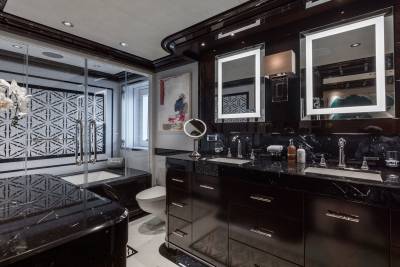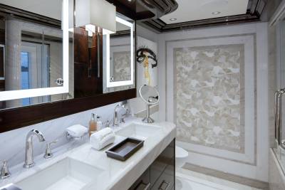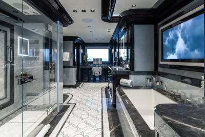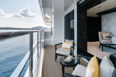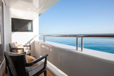 The main deck owner’s apartment features expansive his and hers bathrooms and dressing rooms, a lounge area and has fixed balconies on either side.