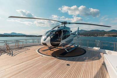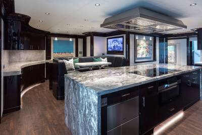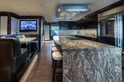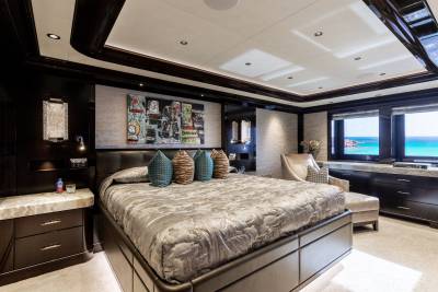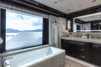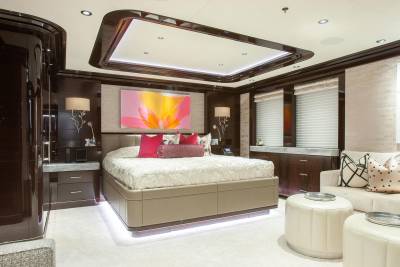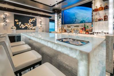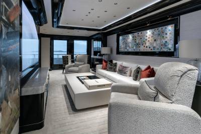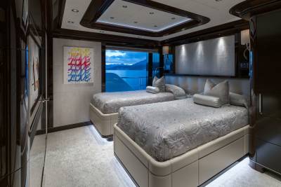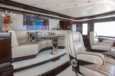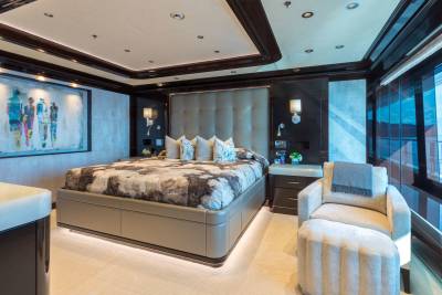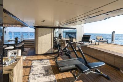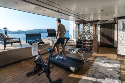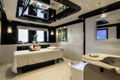 The Amy Halffman Design interiors are comfortable, stylish and sophisticated. Featuring tactile textures and blending neutral tones with subtle colour accents, the yacht’s inviting ambience is immediately apparent in every space. The onboard spa and fully-equipped gym covers all wellbeing needs and an elevator between decks facilitates easy movement around the vessel.