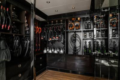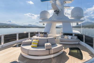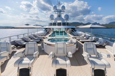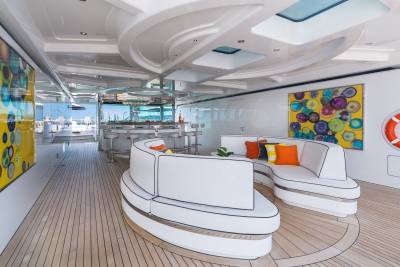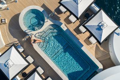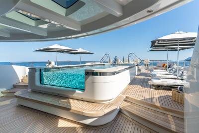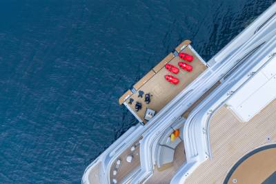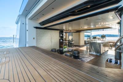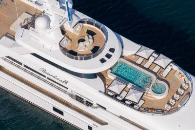 The yacht’s lower deck aft is dedicated to wellness and adventure, featuring a beach and fitness club complete with a dive and watersports locker for unparalleled leisure options. Above, the sundeck is a striking focal point with a beautiful mosaic-tiled pool. While the elevated observation deck offers panoramic views, inviting guests to fully immerse themselves in the surrounding seascape. Boardwalk blends functional design and refined elegance, making her a true standout in the world of luxury yachting.