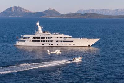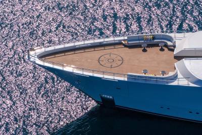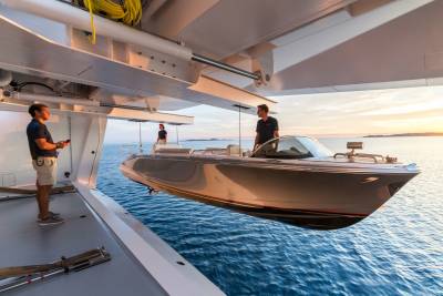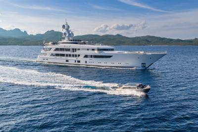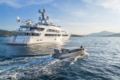 Delivered by the shipyard Feadship, the 76.5m motor yacht Boardwalk showcases the expert naval architecture and exterior design of De Voogt. Her innovative layout includes a spacious forward tender garage on the main deck, capable of housing two luxurious tenders, combining practicality with seamless style.