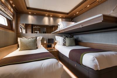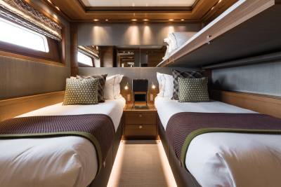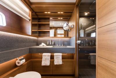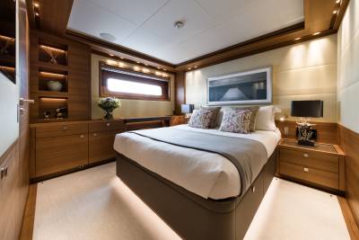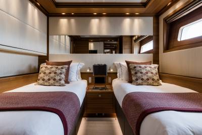 Within Brigadoon’s lower decks, guest cabins unfold as serene private retreats. Two double cabins and two twin cabins are each configured with ensuite comfort, ambient lighting, and quiet surroundings. The guest lobby links them in smooth privacy, while the crew areas remain discreet and efficient. Above, the owner’s stateroom spans off the Main Deck, paired with a dressing room and sumptuous ensuite — a personal domain amid the motion of the sea.