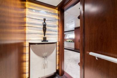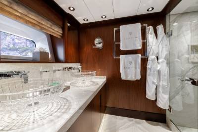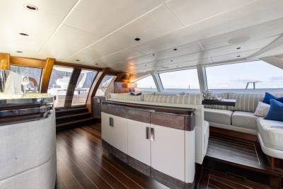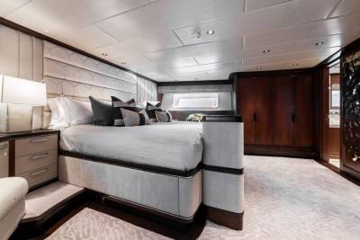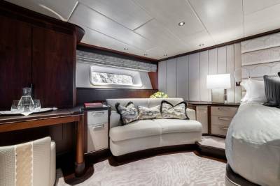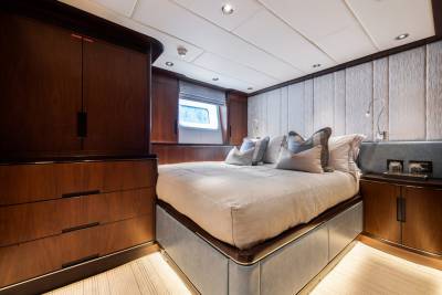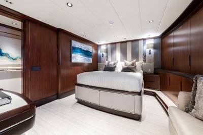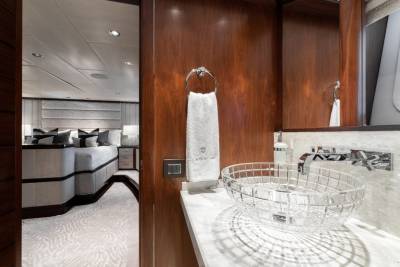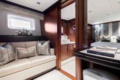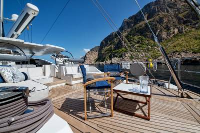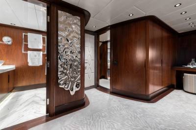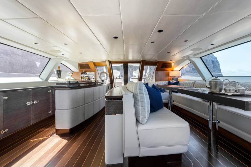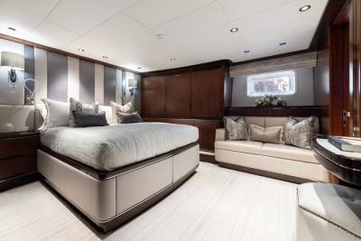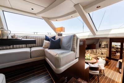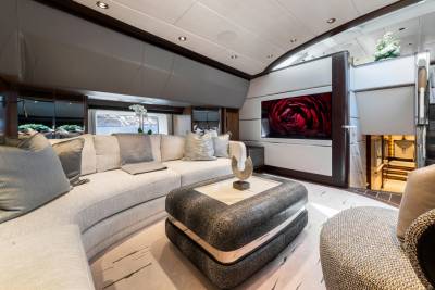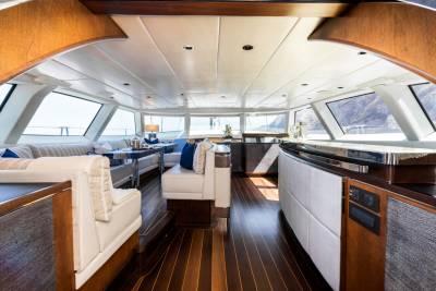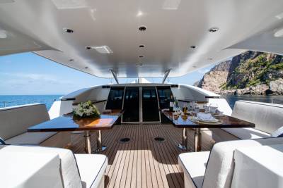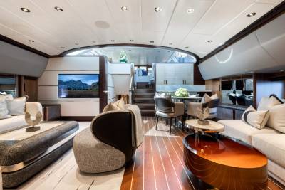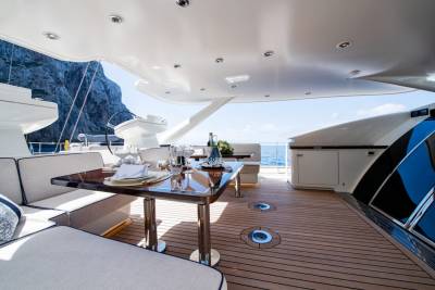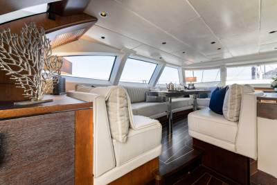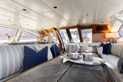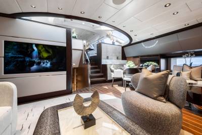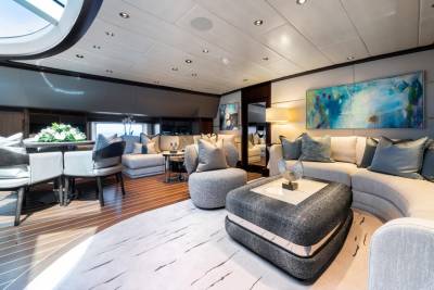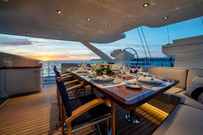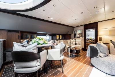 The main salon and outside decks provide ideal spaces for socialising. Her hubs are designed to bring groups together to share the day's activities. The soft furnishings inside are carefully arranged in a circular manner, creating an inviting and social atmosphere. Her outside dining table can be used from morning until night, making it perfect for a casual breakfast or formal dinner, and everything in between.