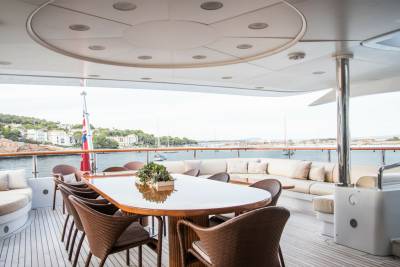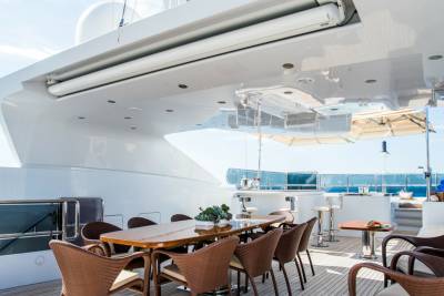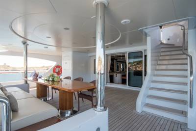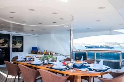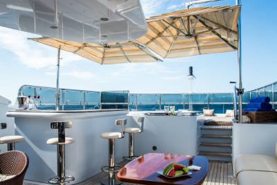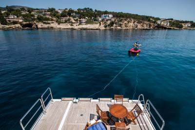 Perfect for family charters, Diane is set up for outdoor fun. Wide deck areas include a sundeck with removable shading, barbecue grill and Jacuzzi. Down on the oversized beach club, jump onto the water toys or relax by the water.