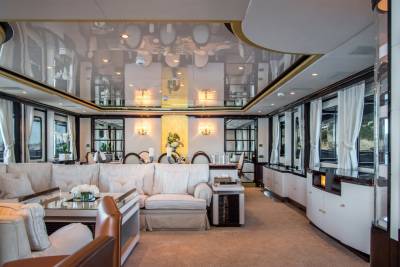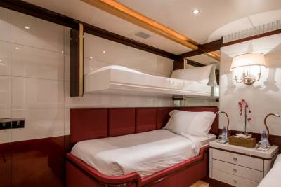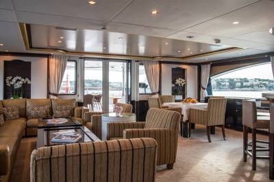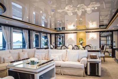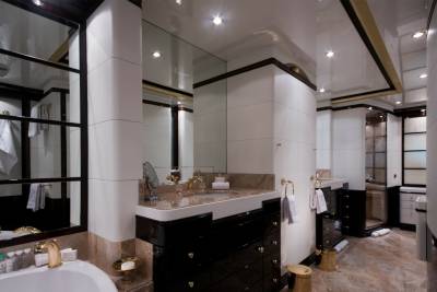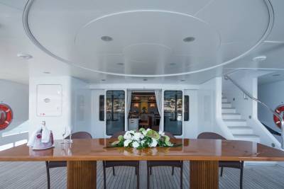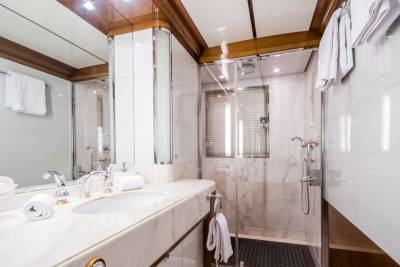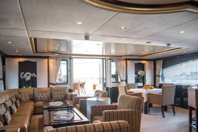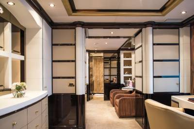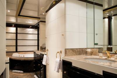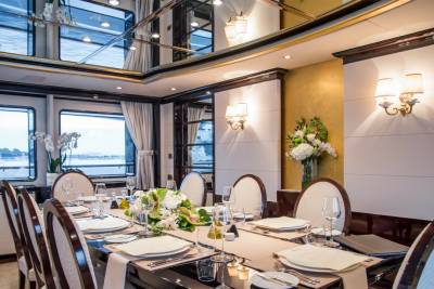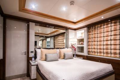 Inside, retreat to the main salon or the sky lounge, filled with light and offering direct access out onto the deck. Equally sized guest cabins with flexible layouts make this ideal for any charter group. The standout master suite features a walk-in wardrobe, exercise equipment and a separate study area.