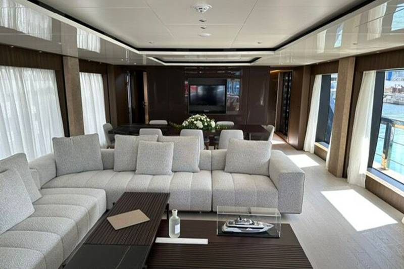 The main saloon and dining area flow naturally, with large windows bringing in light throughout the day. The space feels relaxed rather than formal, well suited to long lunches, quiet evenings or hosting friends without effort.