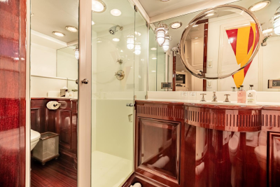The full beam owner’s suite is in keeping with the theme that runs throughout her interiors. Upmost comfort from the king size bed and offering a whirlpool tub to take chilling out to a new level. A yacht of contrasts, the bold mahogany is balanced out with refreshing cream and neutral features.