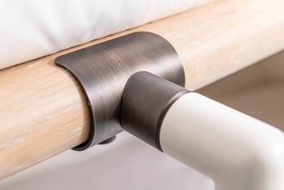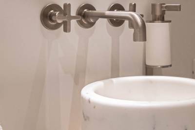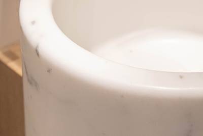 Hammer's luxurious interiors blend white-washed European oak with smooth white satin paint. Bold and modern, the black woven herringbone composite floor with bronze stitching make a striking statement. Every detail has been meticulously considered, from the custom leather storage bags in the master suite to the chunky marble basins in the additional day head.