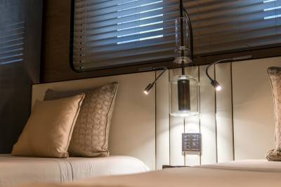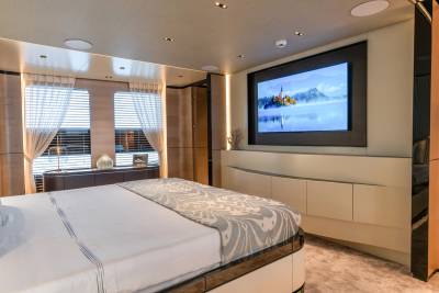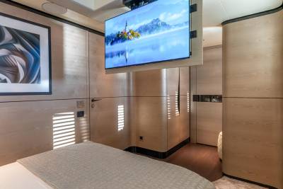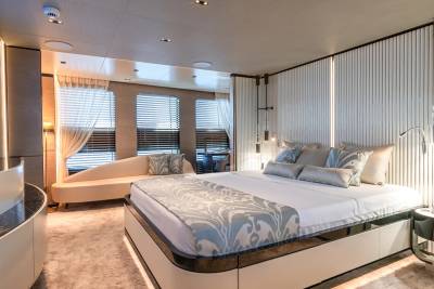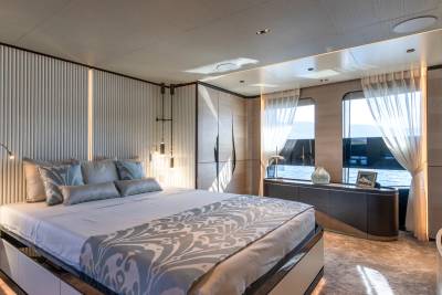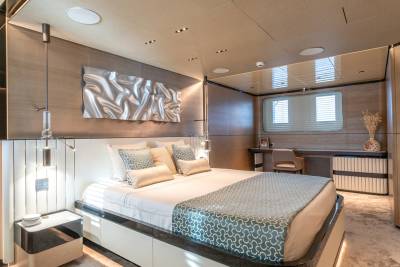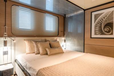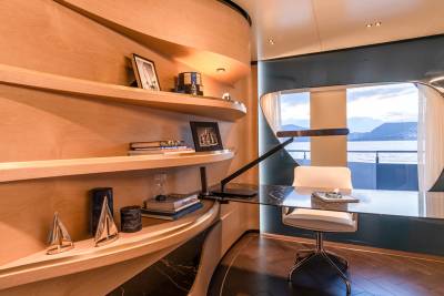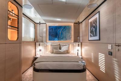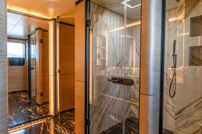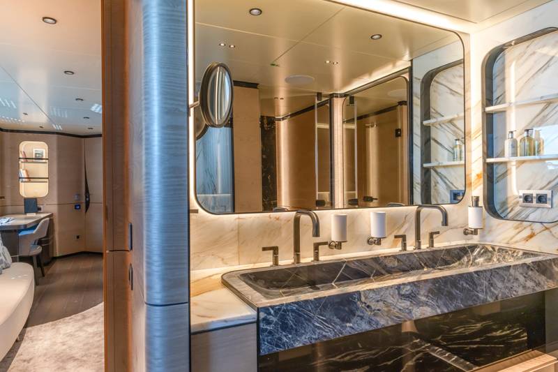 Kasif sleeps 10 guests in five tranquil staterooms, designed with long stays in mind. The full-beam master suite feels private and purposeful, complete with study, walk-in wardrobe, and a spa-style ensuite. Two VIP doubles and two twins below continue the theme of quiet luxury, each with clean-lined bathrooms and thoughtful finishes.