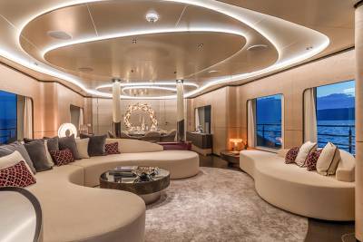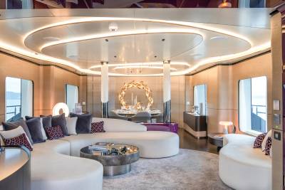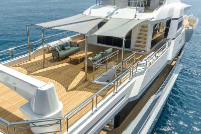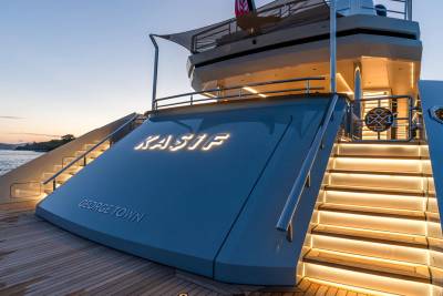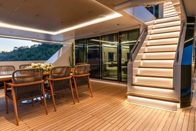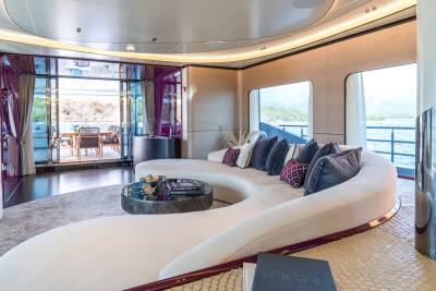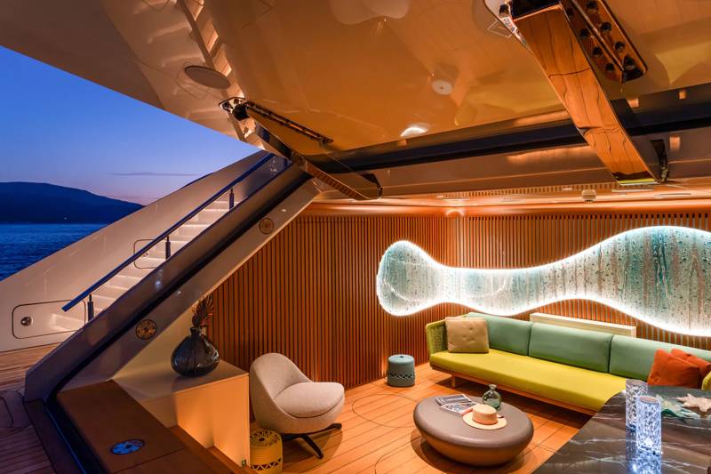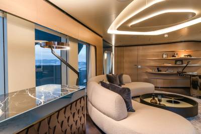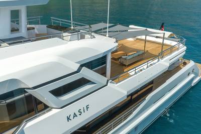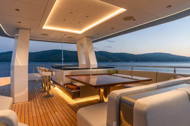 From the shaded skylounge terrace to the wide main deck salon, Kasif’s layout creates connection to the sea at every turn. Glass balustrades and panoramic glazing bring the views in.