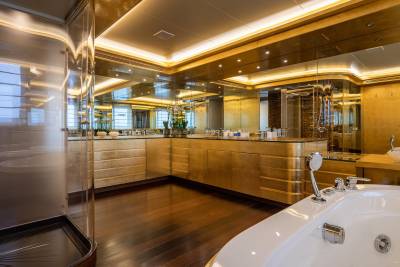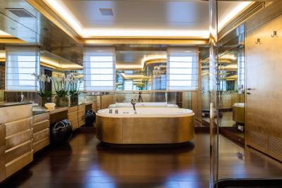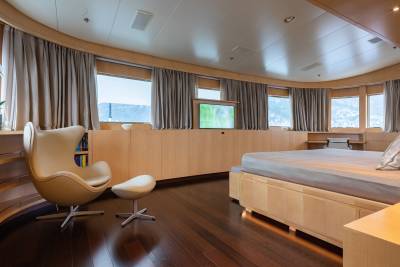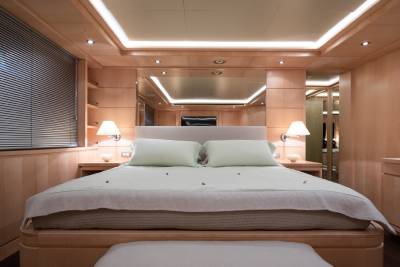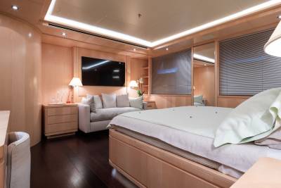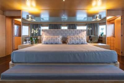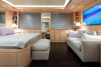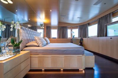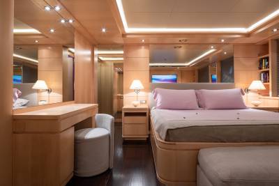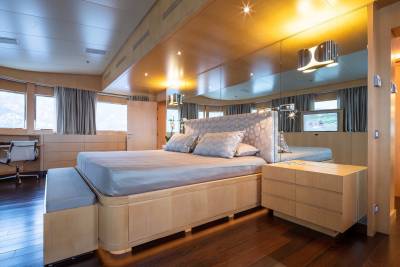 Moneikos can accommodate up to sixteen guests across her luxurious cabins. They are split across all three decks with a lift that connects them for complete ease. Rarely seen on yachts, the Owners Cabin is on the upper deck, just below the sun deck. It is vast in size and provides 180-degree panoramic views out to sea. It is the ultimate design that offers full privacy for families on board.