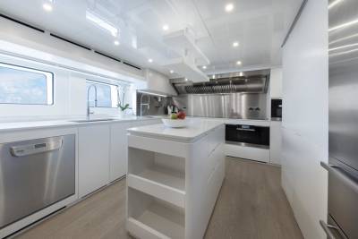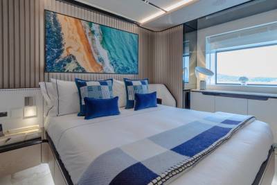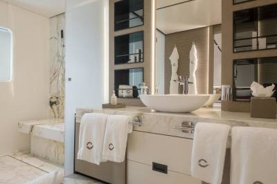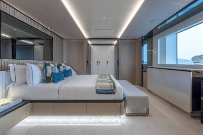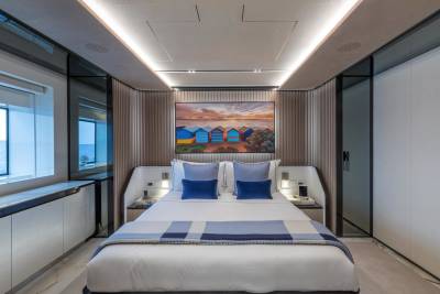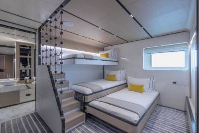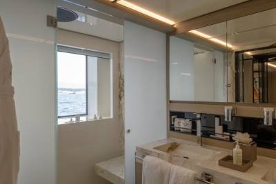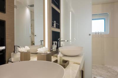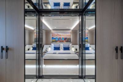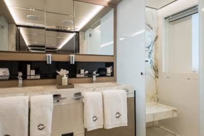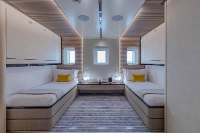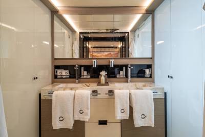 It was a priority to provide multiple options for guests, ensuring no one missed out on a luxury experience. As you walk into the cabins, you are met with the walk-in closets and vanity areas rather than directly into the bedding area as seen on most other yachts. This was inspired by providing privacy to guests.