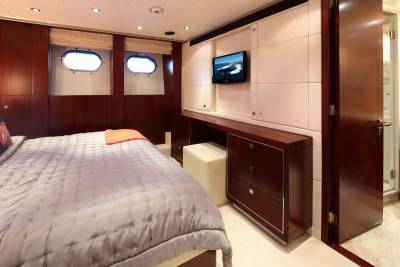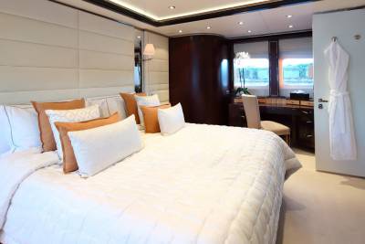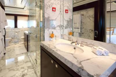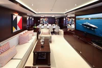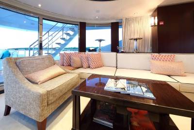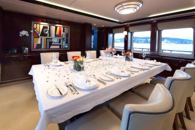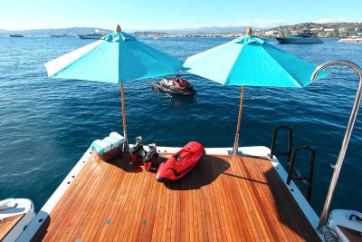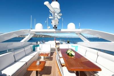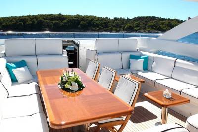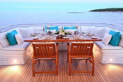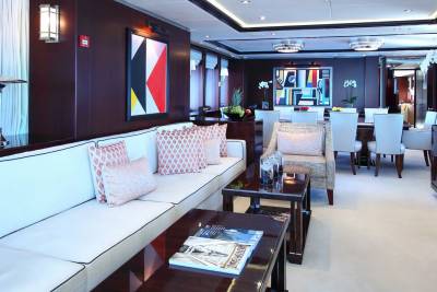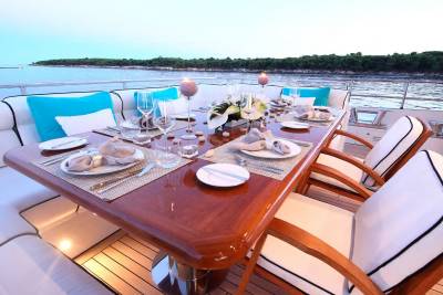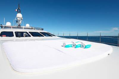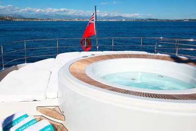 Outside, she benefits from al fresco dining surrounded by upholstered seating on both the aft deck and the sun deck, plus sumptuous sun pads on the foredeck and a Jacuzzi, bar and Teppanyaki grill on the sun deck. Perle Noire cruises at 22 knots and has a maximum speed of 31 knots.