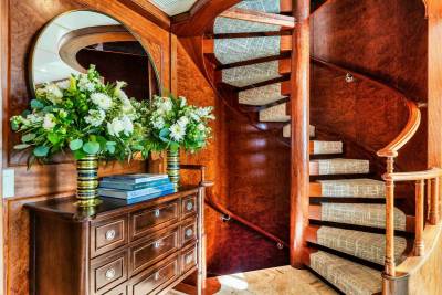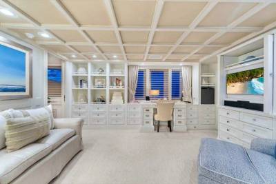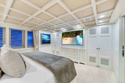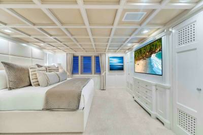 Donald Starkey’s interior design leans towards relaxed sophistication. Large windows flood the main salon with light, while leather-trimmed sofas and a well-positioned bar encourage informal use. The atmosphere feels closer to a private beach house than a traditional motor yacht, appealing equally to owners and guests.