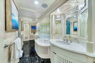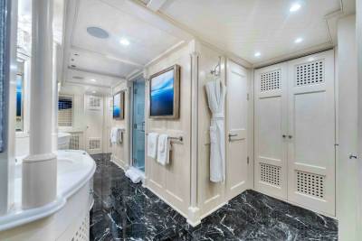 Star Diamond accommodates 10 guests across five ensuite cabins. The full-beam master suite features a king bed, private lounge area and generous storage. A VIP cabin offers a queen bed, while three additional cabins convert between twin, queen or king configurations. This flexibility supports both family ownership and diverse charter groups.
