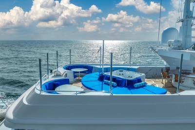 The sundeck is the defining feature of Star Diamond. Two U-shaped bars seat up to 12 guests, while a large Jacuzzi and multiple lounge zones create space to socialise without crowding. Panoramic views and thoughtful circulation make this deck as effective for private ownership as it is for high-end charter use.