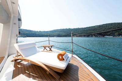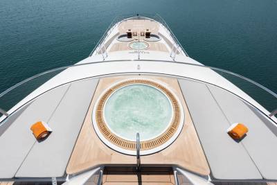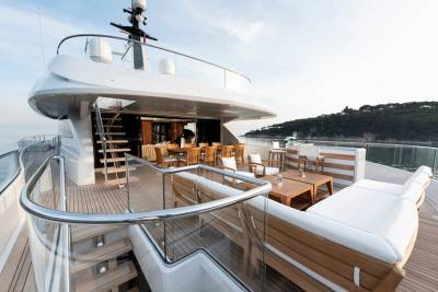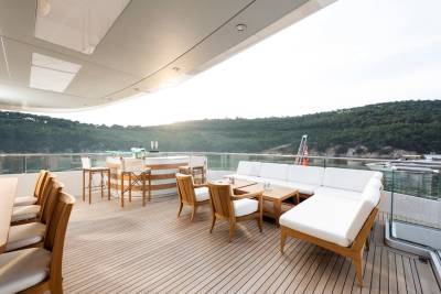 The exterior decks are split into three areas to allow for all forms of entertainment and relaxation. Guests can choose from a walk-around beach club, a saltwater pool, a touch-and-go helipad, and two Jacuzzis. Spend the morning on the top tier enjoying views of the ocean, have lunch in the dining area and finish the day with a sundowner cocktail from the bar.