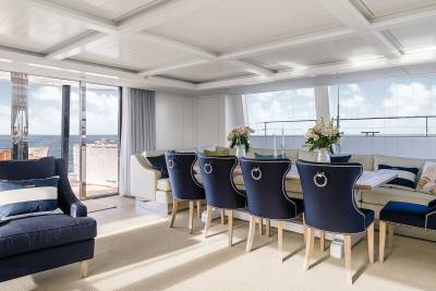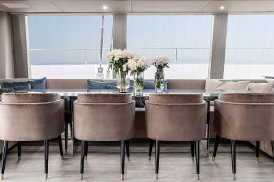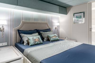 Aboard Lady M, there are three cozy double cabins, and an optional fourth, each boasting a private ensuite bathroom and captivating views of the surrounding beauty beyond.