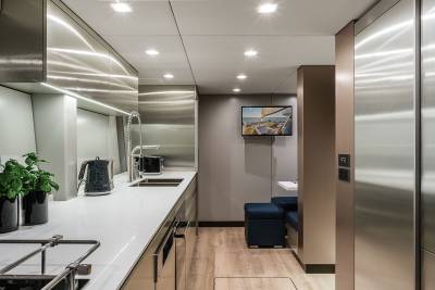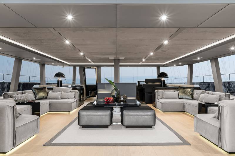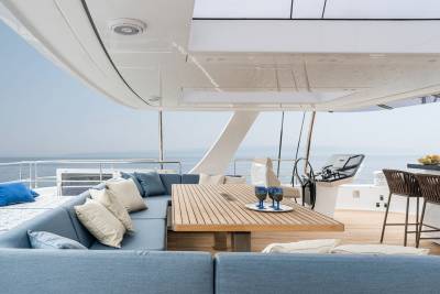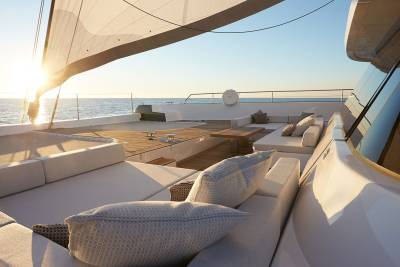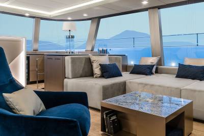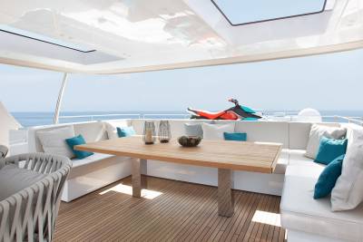 Owners take the driving seat when it comes to the 54msq flybridge. A terrace on the sea, it is dedicated to leisure and lifestyle. The space accommodates the helm yet adapts to individual needs, with movable furniture, a sunken Jacuzzi, fully-equipped wet bar, barbecue and large sunpads creating the framework. Here is where you feel the wind in your hair and the sun on your face while sailing across calm seas.