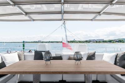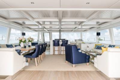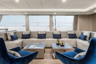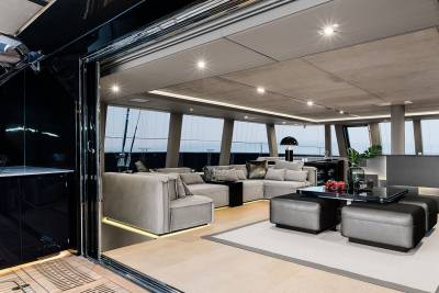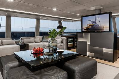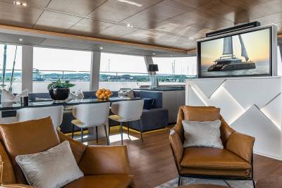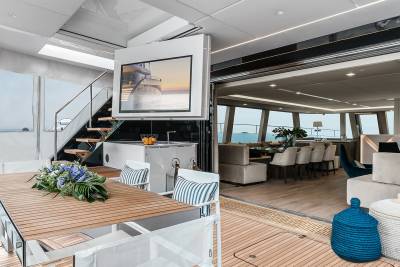 An all-new superstructure makes the Sunreef 80 one of the most spacious and customisable boats in its class. A fresh salon plan affords vast, central lounging space with panoramic views and endless layout possibilities with access to the outdoors from both the bow terrace and cockpit. Choose an open galley for a casual onboard ambience or dedicate the salon space to indoor dining and guest-only relaxation.