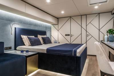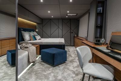 Sunreef 80, with a luxurious walk-in dressing area, a stylishly appointed desk for optimal comfort, a plush sofa to unwind in style, a state-of-the-art retractable TV for entertainment at your fingertips, and a generously spacious bathroom for the utmost in convenience and indulgence.