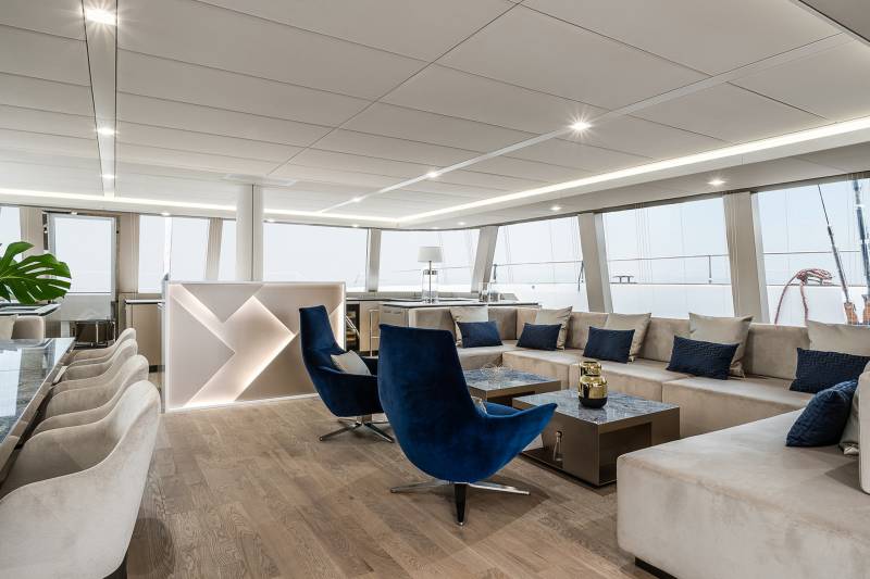 Fresh, inviting and classy, the interior design aboard the Sunreef 80 sets the scene for calm days at sea. Ambient lighting and backlit bars are paired with textured fabrics and cool marble. It’s voluminous living in a compact customised design that hints at shared spaces between guests and crew for authentic sailing encounters, underpinned by Sunreef’s in-house naval architecture.
