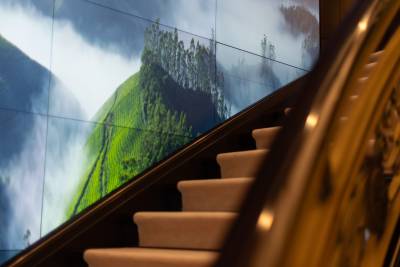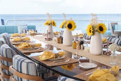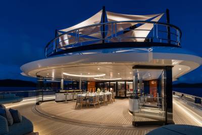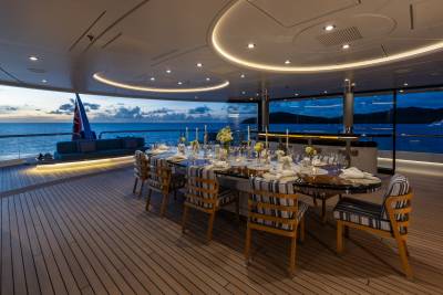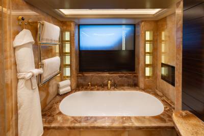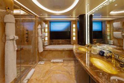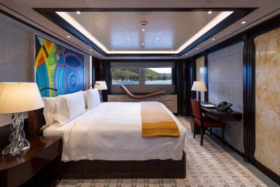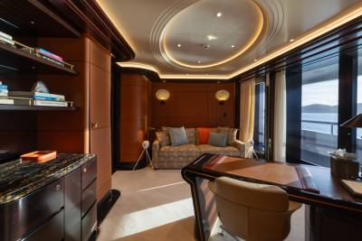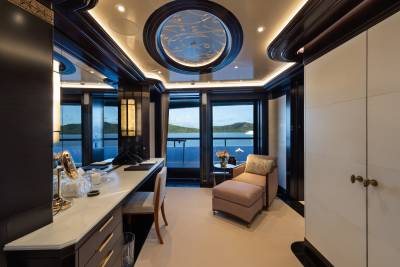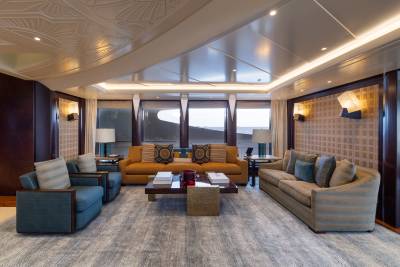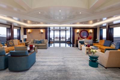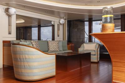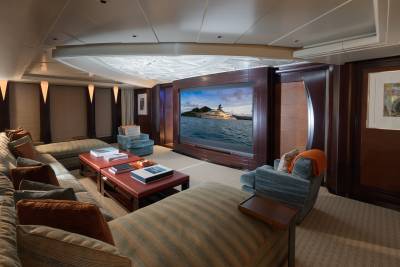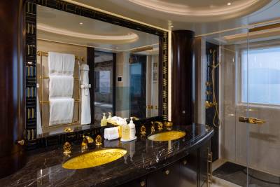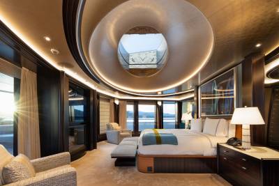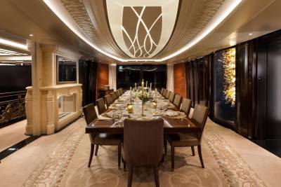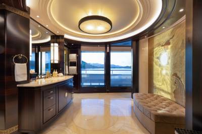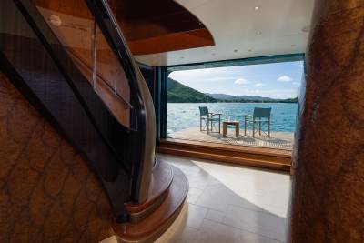 Whisper’s interior is a masterpiece of design, with the ability to cater to both grand-scale entertaining and intimate charter parties. The main guest spaces are located on the main and upper decks; on the main deck, a cinema room adjacent to the guest cabins, that can double as a guest salon or reading room, and the opulent double-height main salon, which is connected to the upper deck lounge and dining room via an impressive atrium staircase, flanked by two video walls, setting the stage for large events.