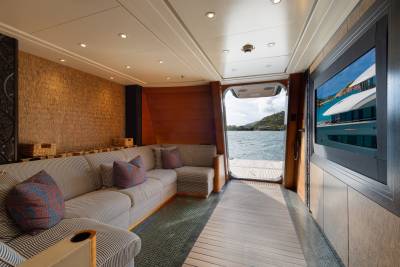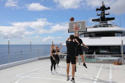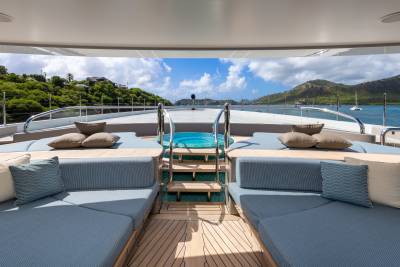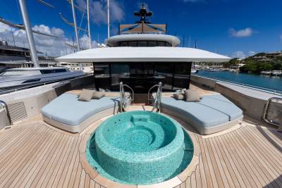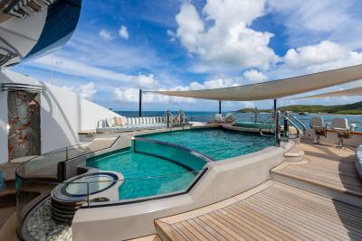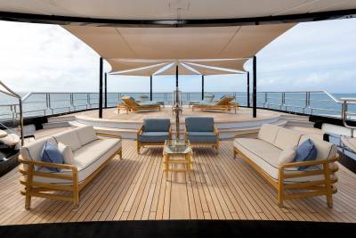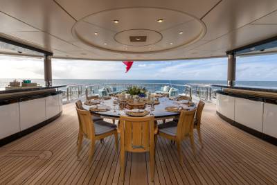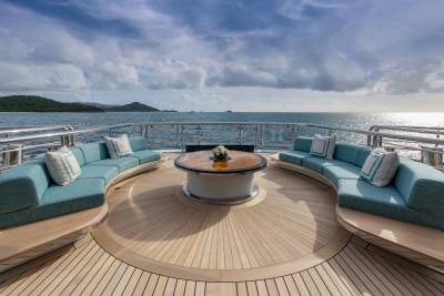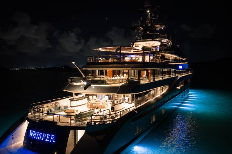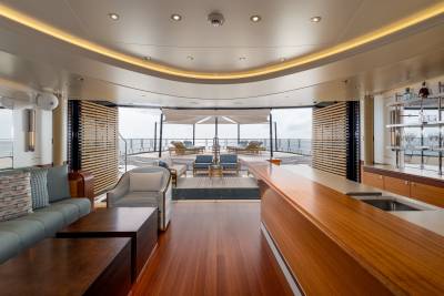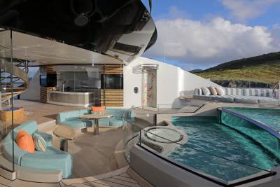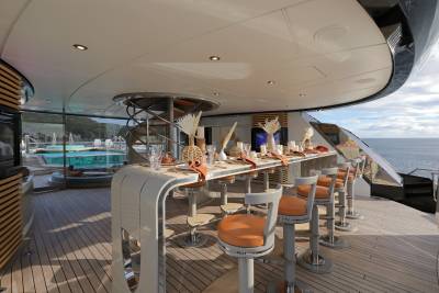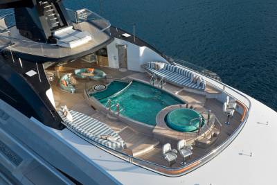 Whisper’s exterior spaces are meticulously designed to cater for both relaxation and entertainment. Generous staircases connect the spaces seamlessly, creating an ideal guest circulation. Make a splash in the sun deck’s 12-metre mosaic pool and integrated Jacuzzi, or take in the views from the observation deck above, accessible via a winding staircase. Pick up the pace with a game of basketball on the foredeck court or enjoy a sundowner on the expansive outdoor lounge area. The vast aft deck, which can be configured as a large sports bar or even a night club, is the perfect way to end the evening.