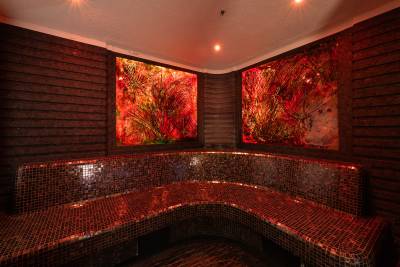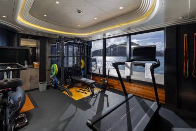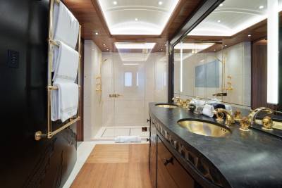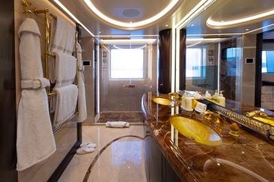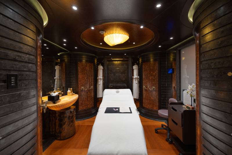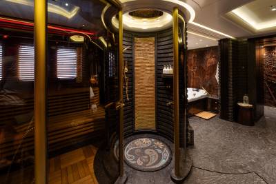 Located on the lower deck, Whisper’s spa, with hammam, spa pool, cold plunge pool, steam shower and massage room, provides a sanctuary for relaxation and rejuvenation. This meditative space combines dark stones with intriguing, juxtaposed textures, from smooth flat rocks to elegant glass and various wood surfaces, and is bathed in soft, gentle lighting, creating a serene ambiance that invites you to unwind and let go.